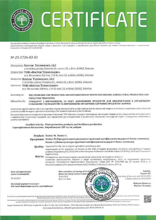 Ми прагнемо до зеленого майбутнього, наша органічна сертифікація від Organic Standard це підтверджує. Цей сертифікат гарантує, що наші біопрепарати не містять шкідливих хімікатів, створені з повагою до природи та призначені для сталого догляду за вашими рослинами. Довіряйте нашим екологічним рішенням для процвітання врожаїв та здоров’я екосистеми.